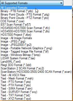 This procedure will allow you to import data from a variety of pointcloud formats. Other available formats include: