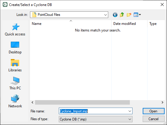 Enter a name for your Cyclone Database (IMP) file and Pick "Open" twice: