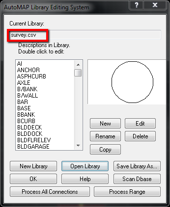 In the AutoMap editor you can view the current library or open a new library. We provide some examples of libraries in C:\ProgramData\MicroSurvey\MSCAD\****\mscad. Let’s look one up by picking on “open library.” You can note that I have chosen the “survey.csv.” The field codes located in this document (.csv file) coincide with typical land surveying objects such as “BLDG” for building.