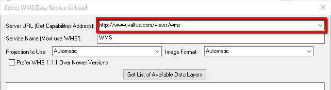 - Enter the Server URL, this is http://www.valtus.com/views/wms and leave other settings default values: