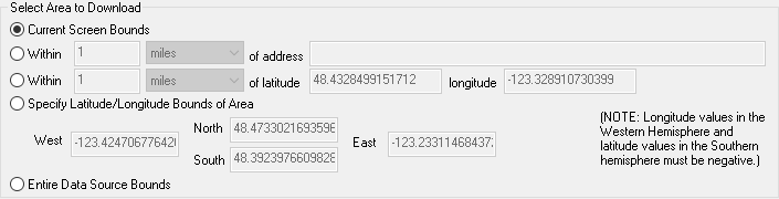 - With your layer selected, you can set Area to Download. "Current Screen Bounds" is a good one to start with: