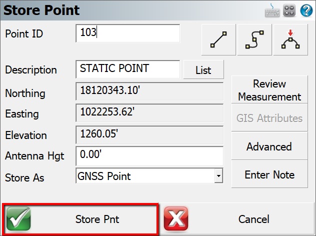 - The Point ID you assign when you store the measurement will be used to tag the static data in the post processing software.