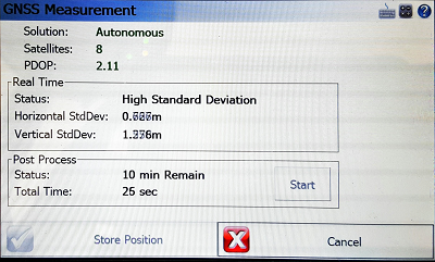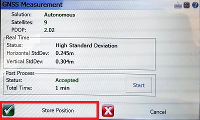- The screen shows the measurement status, note the Store Position button is not available while the measurement is in progress:
