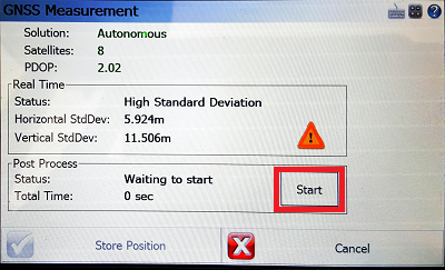 - With the Post Processing option set to manually start, a Start button will now be available in the GNSS Measurement screen: