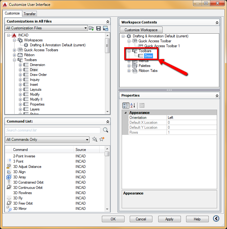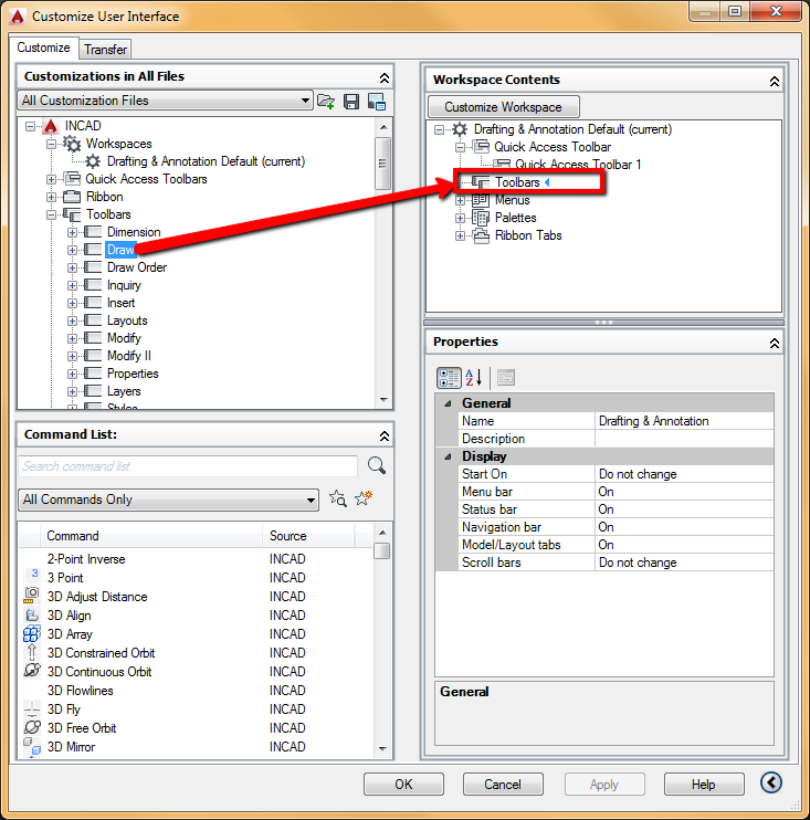 3. Expland the Toolbars menu. This will list all available toolbars. Drag and drop a desired toolbar (ex. "Draw") into the Toolbars menu in the Workspace Contents window.