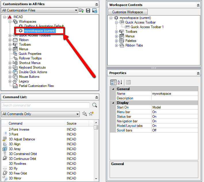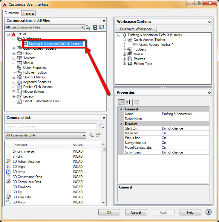 2. In the CUI, expand Workspace to display the default workspace "Drafting & Annotation Default". Notice the window on the right will now display Workspace Contents.