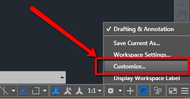 1. In the lower right corner of the program, expand the workspace menu (small gear symbol) and select "Customize...". Or type the command "CUI" in the command line.