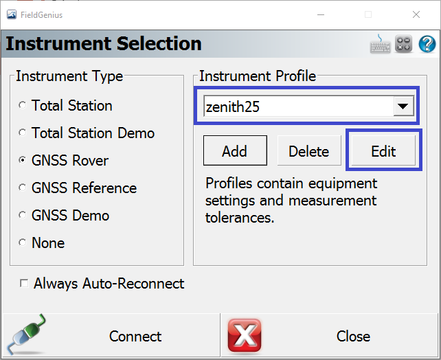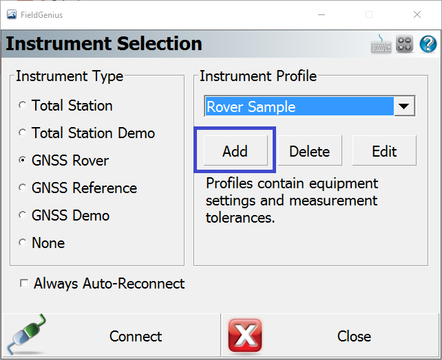7. Choose your Instrument Type (ex. GNSS Rover) and then choose "Add" to create an Instrument Profile.