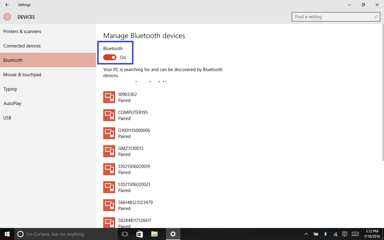 1. Open the Bluetooth Devices menu (Start > Settings > Devices > Bluetooth). Ensure Bluethooth is turned ON.