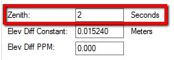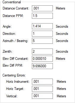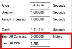 | Elev Diff Constant and Elev Diff PPM ONLY takes effect if you are manually entering 3D data in the form of horizontal distances and vertical differences. Not used very often. Elev Diff Constant: use your judgement, it just has to be non-zero Elev Diff PPM: if Elev Diff was computed from zenith observations and slope distances you can derive a PPM after computing the zenith value above. PPM=sin(zenith)*1000000 Eg: 2 observations with a 1 second instrument: Sin(2”)*1000000 = 9.696 PPM Eg: 6 observations with a 2 second instrument: Sin(2.309”)*1000000 = 11.196 PPM Elev Diff PPM values applied to elev diff input compare well to zenith values applied to zenith/slope distance input for computed Z standard deviations in the listing when slopes are shallow, but are less effective for steep observations. |