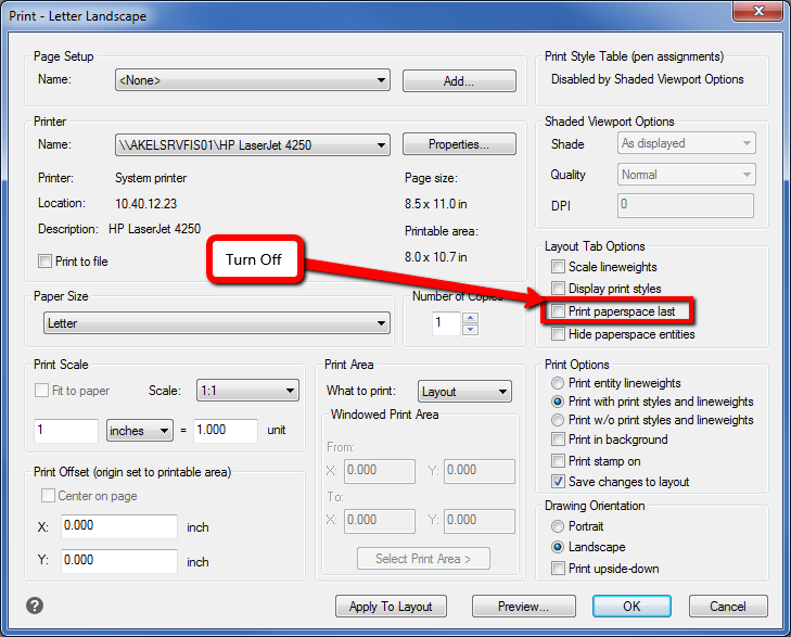 Solution - Turn off Print Paperspace Last option in the print menu