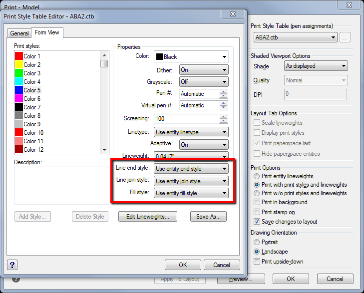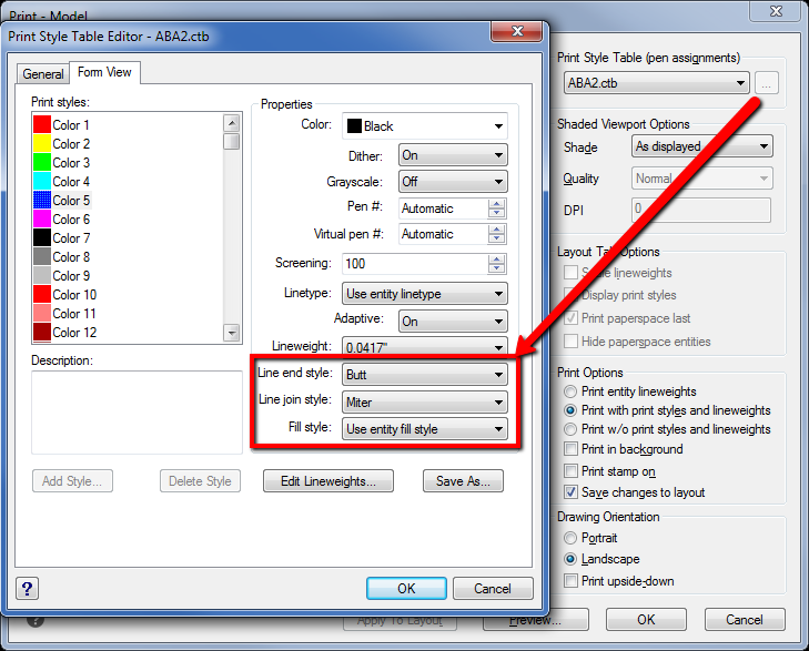 Solution: Edit the CTB file in the Print Option menu. In this example Colors 3 and 5 (Green and Blue) were set to use Butt ends and Miter joints. Changing these settings to "use entity style" will solve the issue. Choose "Save As" if you would like to save new copy of your CTB file with the updated settings. For more information on CTB files please see "Print Style Table Editor dialog box" in the MSCAD help.