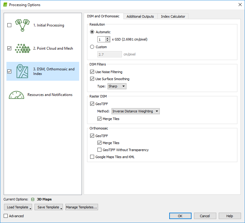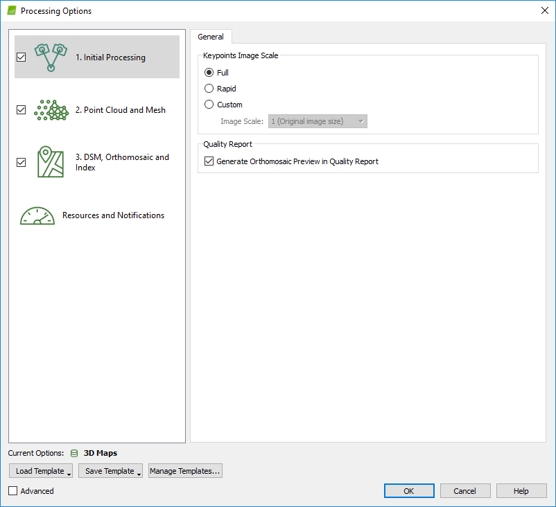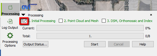 14. This will take a while. When complete, examine the Processing Report. If the results look good, check on Options 2 and 3 and pick “Start” to complete the creation of a pointcloud and orthomosaic.