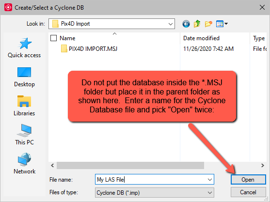29. Enter a name for your Cyclone Database (IMP) file and Pick "Open" twice: