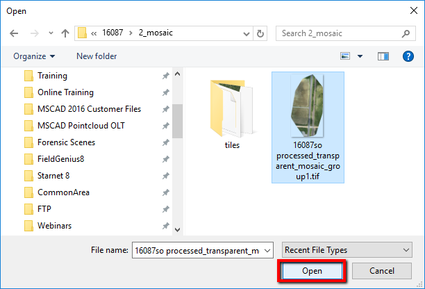 44. Import the Orthomosaic file found in the dsm_ortho folder: