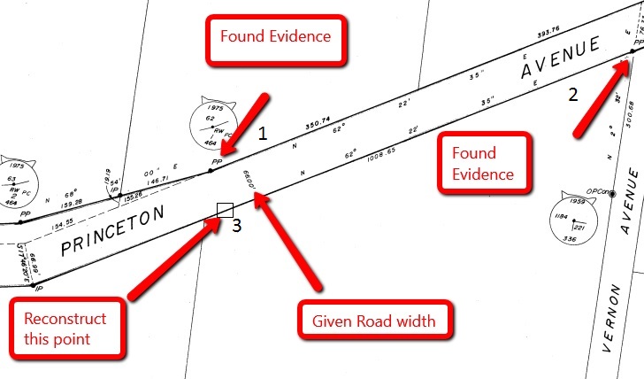 MicroSurvey's COGO routines can be used to solve many geometry problems to reconstruct lots from evidence. In the scenario below, the road width is a known, and two Pipe Posts have been found, one on the southerly side and one on the northerly side of the road.