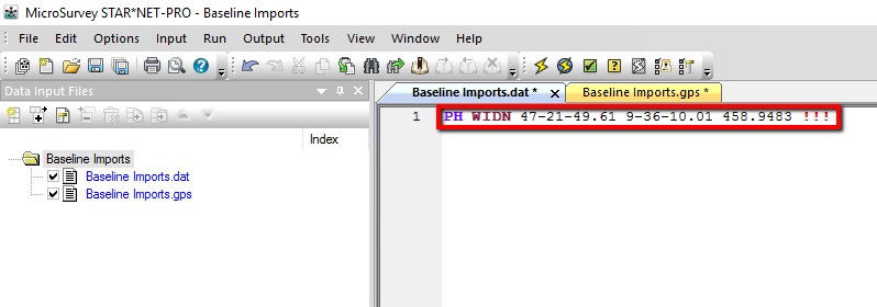 3. Be sure that you have constrained a point to use for control in your project. In the example below I have entered a lat/long for the WIDN point and entered it as a "PH" record that is held fixed using the "!!!" symbols: