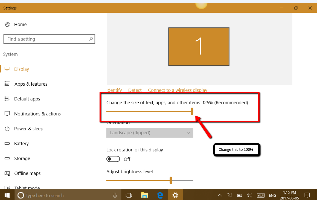 2) Change the size of text, apps, and other items to 100%