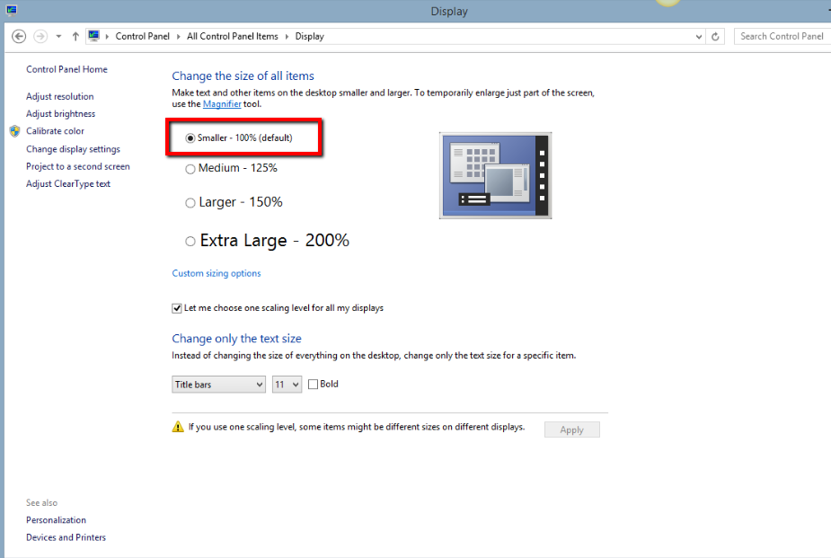 2) Click on Let me choose one scaling level for all my displays. Choose Smaller - 100%