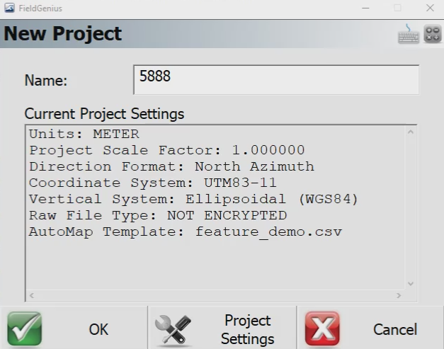 Step 1: Launch FieldGenius and open the original project you wish to change the coordinate system. (In this example, Project 1234 was the original and Project 5888 was the new one created.)