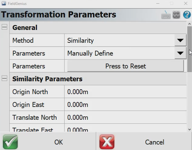 Step 8: Click on the Plumb Bob > Survey Tools > GNSS Local Transformation > Modify Parameters. From here, change the Method to Similarity and then the Parameters to Manually Define. Leave the rest of the parameters at their default settings and click OK.