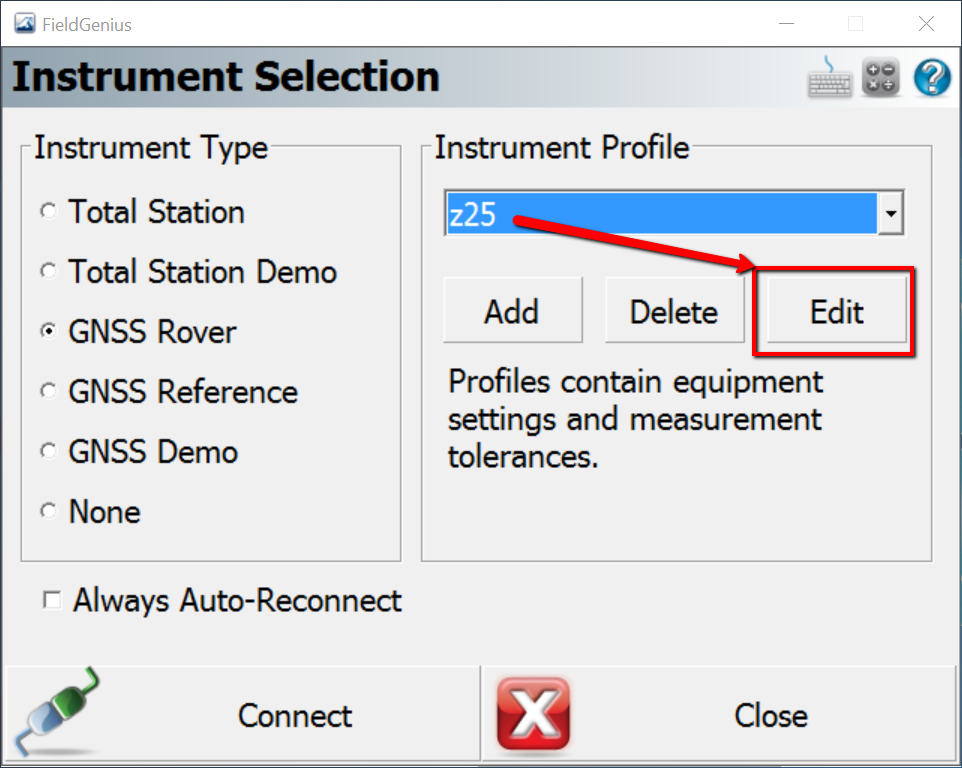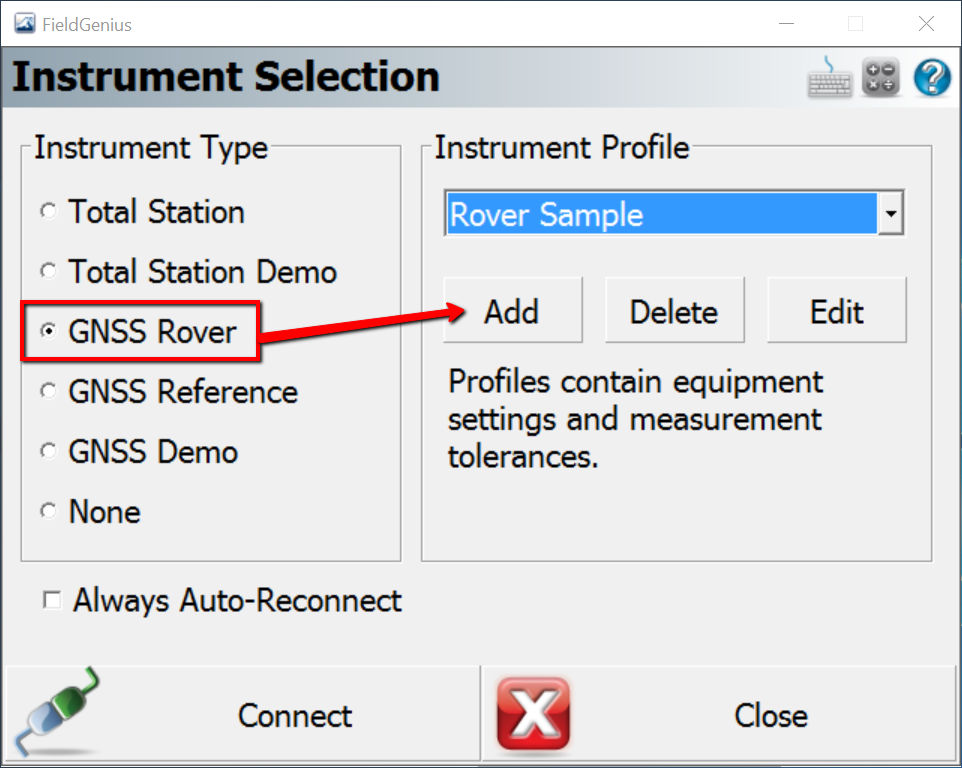 Step 12 - After opening or starting a new project you will enter the Instrument Selection menu. Choose GNSS Rover > Add, to create a profile for the Zenith 25.