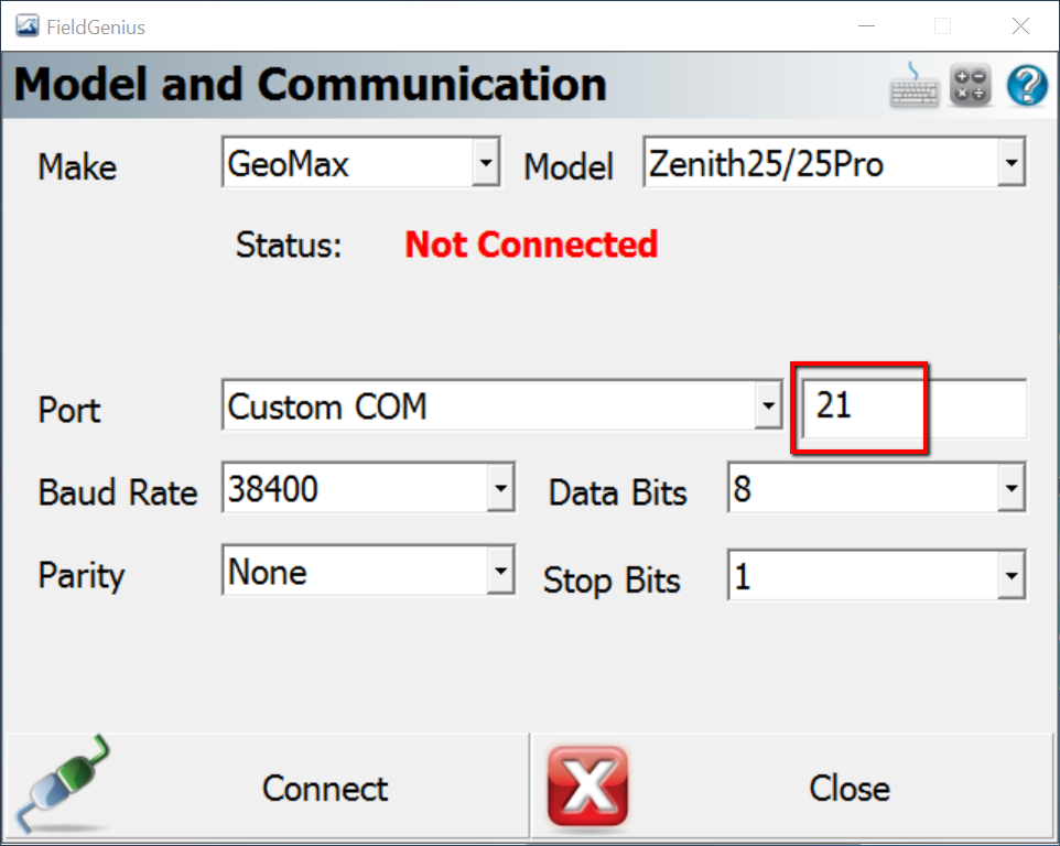 Step 14 - Pick Model and Communication and modify the settings to match below. Note the COM Port from Step 3 must be selected. Click Connect