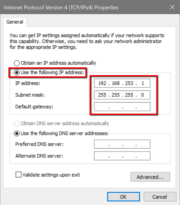 Step 11 - Select Use the following IP addresses and enter the IP address 192.168.253.1, and 255.255.255.0 under the Subnet mask.