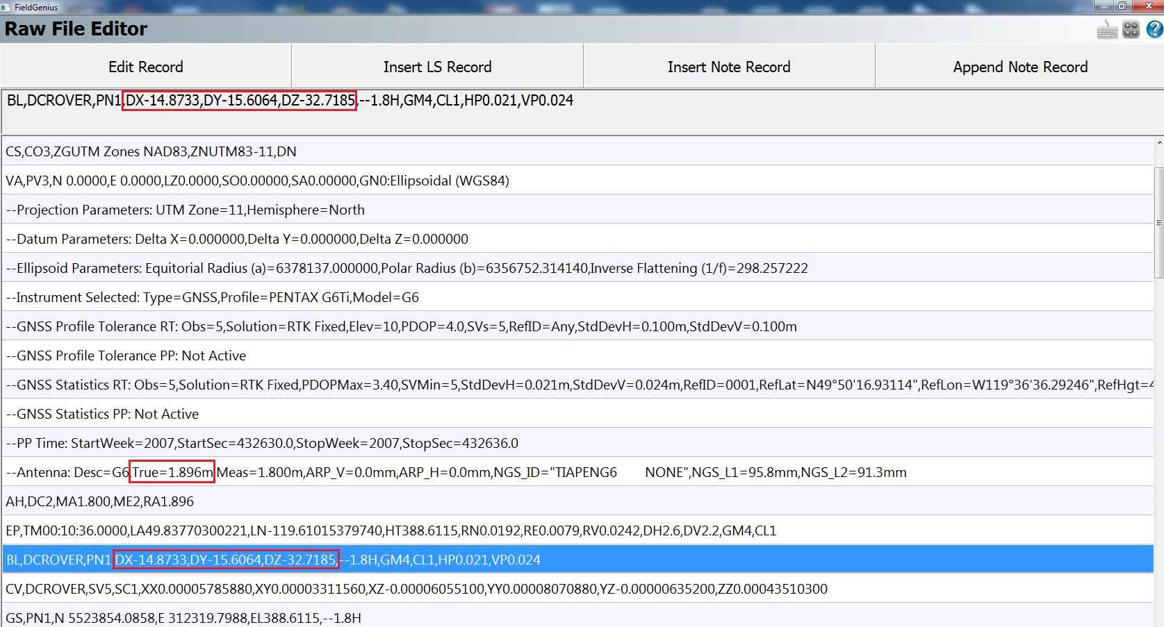 In STAR*NET, the G1 line contains the DX, DY and DZ dimensions between the Base and Rover, as well as Antenna Heights of both. When importing FieldGenius vectors into STAR*NET, these values are read from the BL line, which can be found in the FieldGenius raw file.