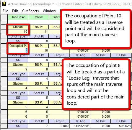 | Occupied points are described as follows in the Help documents: "MicroSurvey CAD also has the ability to process a "Loose Leg" traverse. The setups that are not on the main traverse loop need to be entered as "Occupy Points" instead of "Setup Points". These points will be reprocessed correctly when the traverse is coordinate. The program will also re-compute these points when you perform an angle balance or a traverse balance. " See below for an example of how "Station" and "Occupied Pt" records differ: |