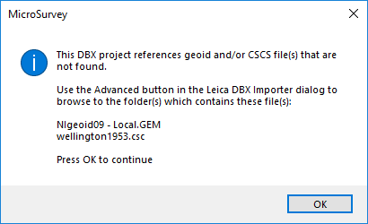 The error message that appears when trying to import: "This DBX project references geoid and/or CSCS file(s) that are not found. Use the Advanced button in the Leica DBX Importer dialog to browse to the folder(s) which contains these files(s)"