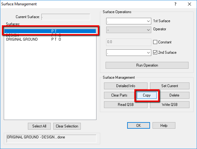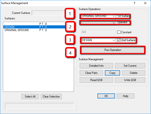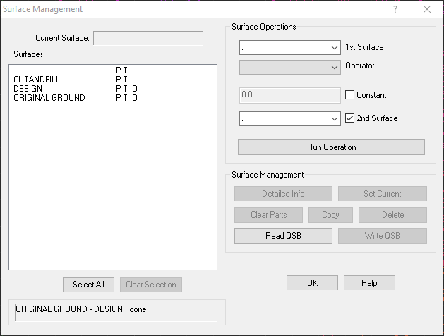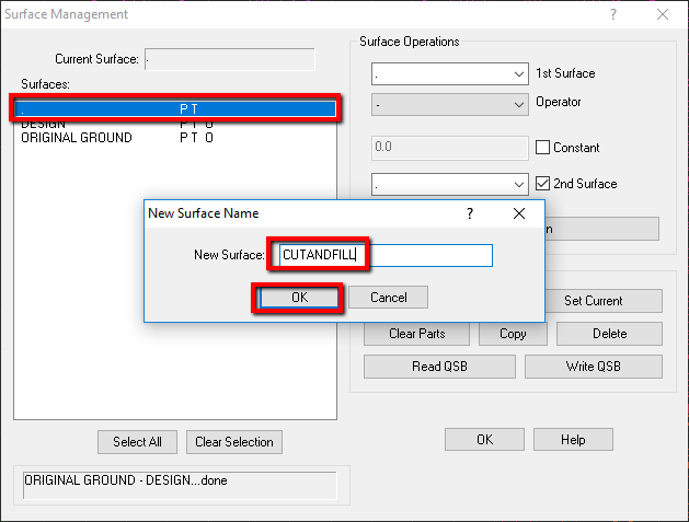 Once you have built two surfaces and have them in working memory, create a new surface named "Cut and Fill" by using Surface Operations to subtract the Design Surface from the Original Ground Surface: