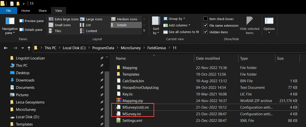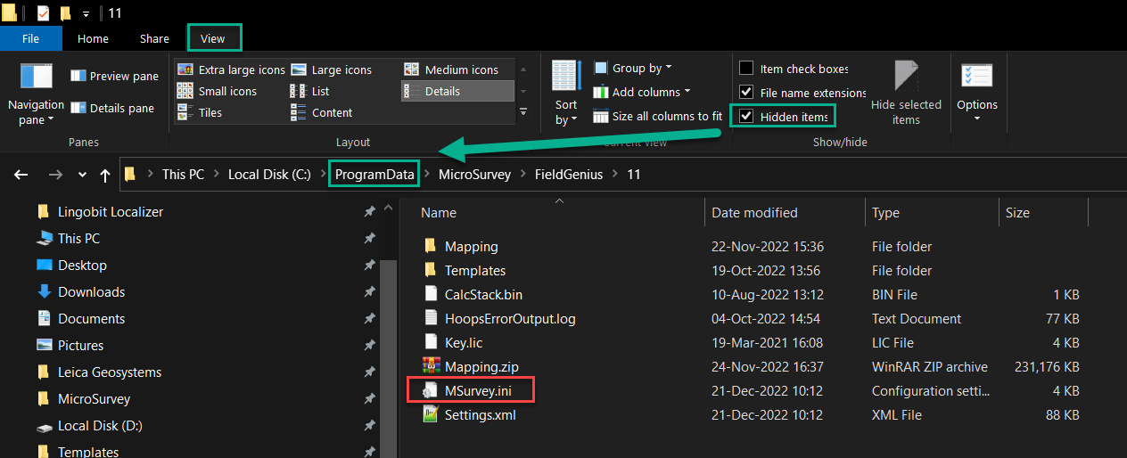 - Browse to this location: C:\ProgramData\MicroSurvey\FieldGenius\(Version Number)