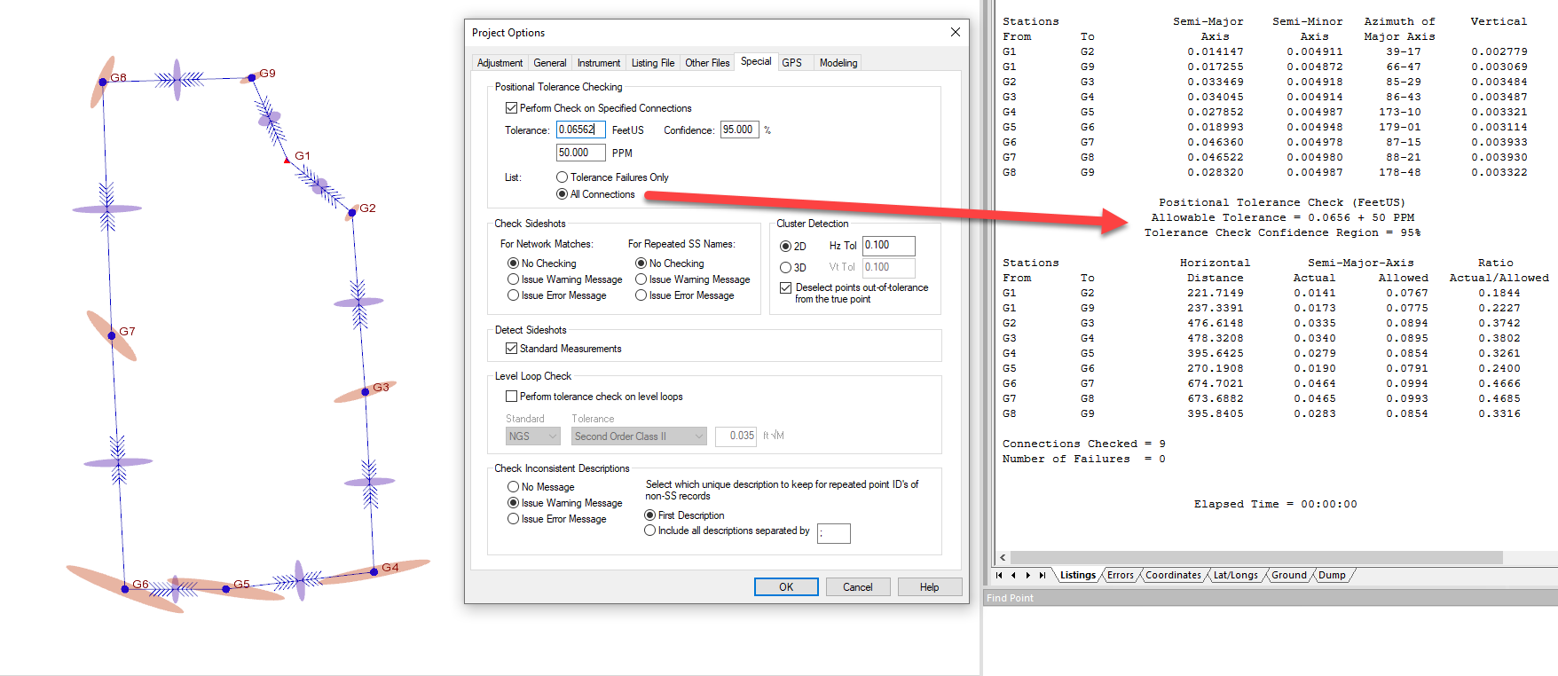 - Run an adjustment or pre-analysis and check in the Positional Tolerance Check section of the listing for any error ellipse that exceeds the allowable amount.