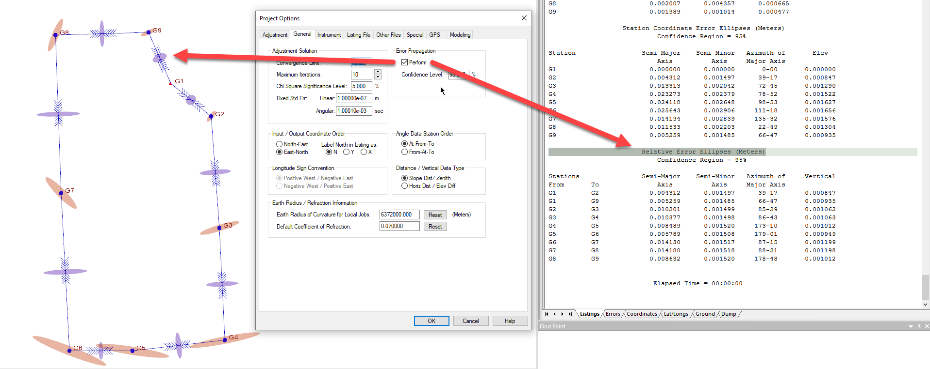 Relative Error Ellipses describe uncertainty of one point relative to another point (uncertainty of the line’s coordinate differences, or its distance and azimuth) in a network. Relative error ellipses are computed in STAR*NET when Project Options | Error Propagation | Perform is checked on and a confidence level set.
