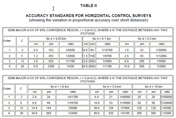 On Page 15 of the document, surveyors are directed to simulate a proposed network in a computer (or, as we say in STAR*NET, perform a pre-analysis) and apply the r = c(d + 0.2) formula to compute maximum allowable semi-major axes of 95% confidence . A table is provided by NRC which provides C and examples of allowable semi-major axes (in centimeters) in the "cm" column for a variety of distances:
