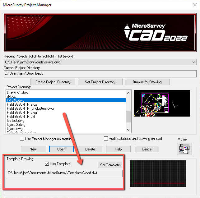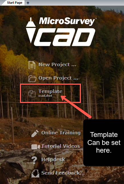 Select a template to be applied to new drawings in the MicroSurvey Project Manager or Start Page: