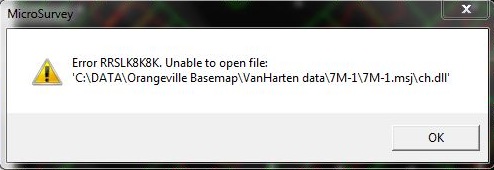 When importing an ASCII file or performing a function that moves points users report error message RRSLK8K8K, referring to the file ch.dll, as in the example below:
