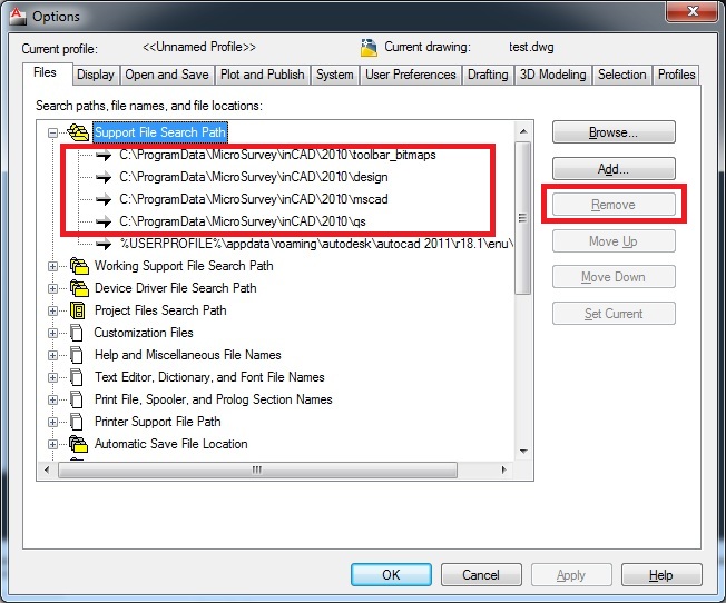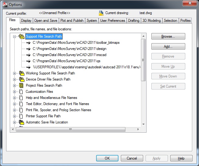 - Open the options dialog as shown below. You will see that some old Support paths are still pointing to the inCAD 2010 location.