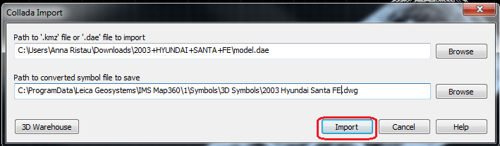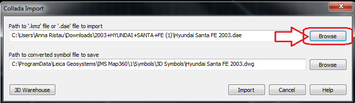 9.) Back in the IMS Map360 program in the Collada Import dialog box select BROWSE as shown below to your Download directory to locate the symbol just downloaded: