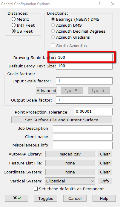 The linework in all cases remains at full scale so you can measure between points and get the same distance as you would in the field. The Drawing scale is used to automate the calculation of how big the lettering should be in this diagram so that when you plot this out to paper the lettering will be at the correct size. When you run the Print/Plot command you should maintain the same plotting scale as you entered for the drawing scale. This ensures consistency and you will get a plot that is correct in scale for both the linework and the lettering/symbols.
