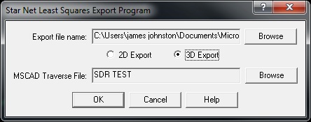 The dialog below allows you to select a traverse file from your MicroSurvey CAD Project and to browse to the location you would like a STAR*NET dat file to be created.