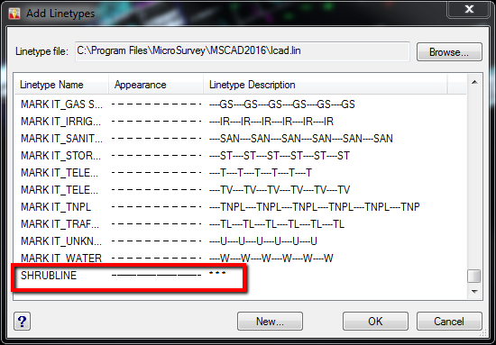 5) After you have created the .lin file using your shapefile open this up in notepad and copy the text and place it at the end of the Icad.lin file located here: C:\Program Files\MicroSurvey\MSCAD20XX