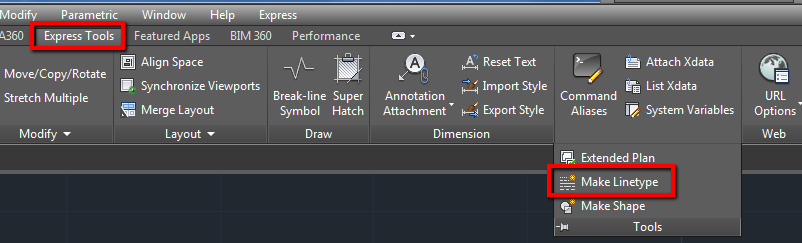 4) You can then use the Make Linetype in the Express Tools>Tools>Make Linetype to create your complex linetype.
