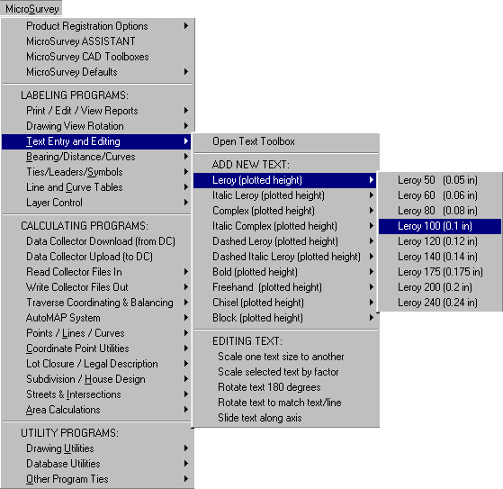 Look under the MicroSurvey pulldown menu -> Text Entry and Editing. In here you will see many different styles of text that we have provided to you. Each one with several different preset sizes or heights. (see below)