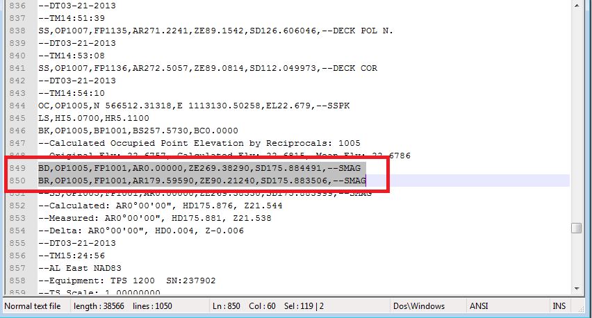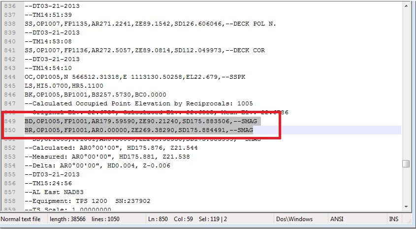 The Carlson convertor is expecting the first record for ZE at line 849 to be a Face 1 value and coded as a BD record. Line 850 is expected to be the Face 2 value and a BK record. In this case the user started the check backsight on face 2 and finished on face 1. The STAR*Carlson converter checks that Zenith angles are between 0 and 180 for all BD lines and will issue the error message above if the data fails that test.