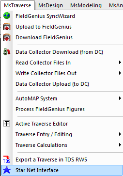 | Traverses that have been manually entered, created by using the "Existing Point Traverse (new)" routine, read in using theFieldGenius SyncWizard Routine or read in by reading in one of the many supported data collector formats under the MsTraverse Menu can be exported directly to STAR*NET using the STAR*NET Interface. |