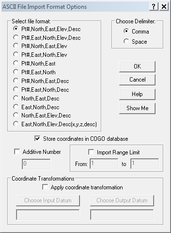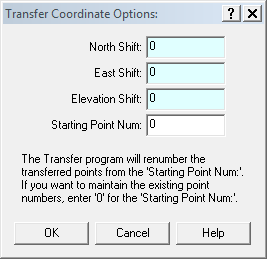 | You can renumber your points if there are conflicting point IDs in the destination project. Or you can retain the existing point IDs by setting the "Starting Point Num:" as zero. You can apply an XYZ shift if you wish, but take care to ensure these points aren't later re-imported into your "Master" STAR*NET project. |
