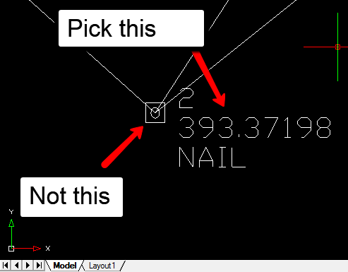 | If you select "Yes" the routine will allow you to select the points to be inserted. Be sure to select the text label for the points, NOT the block that represents the point: |